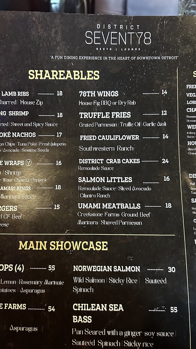 Welcome to District Seventy8, an exciting culinary stop in Detroit, located at 78 W Adams Ave. This brand elevates dining with a diverse menu that caters to various palates. Start with their fresh Caesar Salad, featuring charred Romaine hearts, creamy Caesar dressing, and crispy bread crumbs for just $11.50. Alternatively, their House Salad offers a vibrant mix of greens, cucumbers, tomatoes, and red onions, also priced at $11.50.